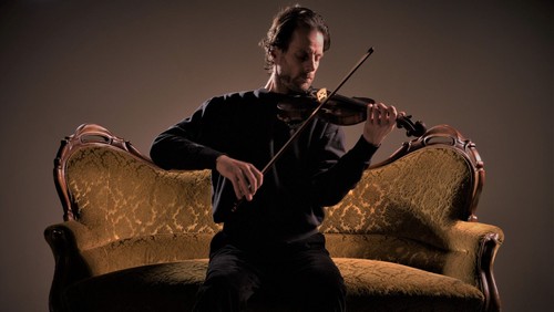 Oplev Markusevangeliet fortalt udenad med korte indslag af egenkomponeret musik spillet på violin, og sat sammen med sort/hvide fotografier vist på billedskærm.